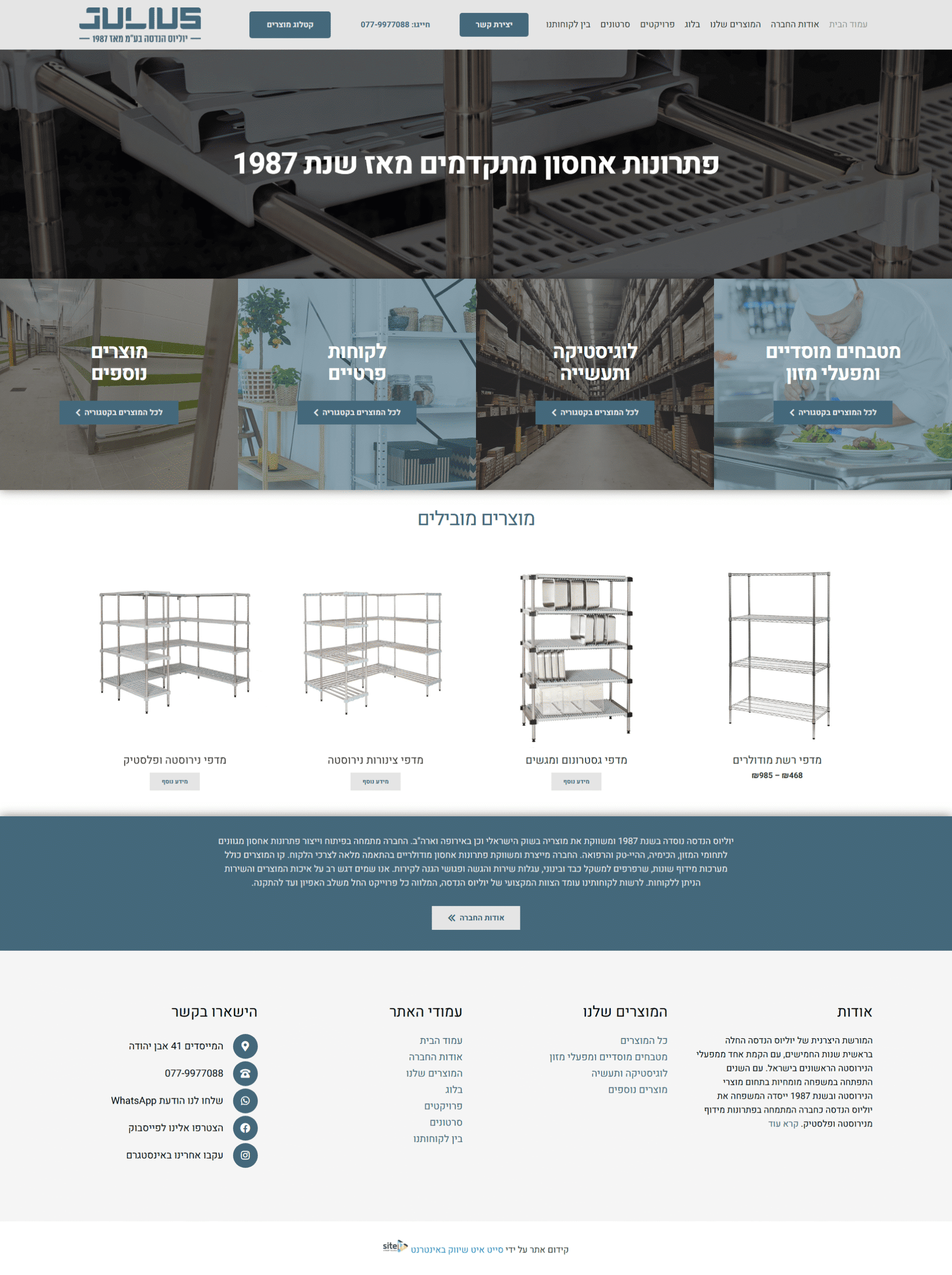 יוליוס הנדסה נוסדה בשנת 1987 ומאז מובילה בפיתוח וייצור פתרונות אחסון מגוונים לתחומי המזון, הכימיה, ההיי טק והרפואה. החברה מתמחה במערכות מידוף מודולריות מותאמות אישית ובמוצרים משלימים כגון עגלות שירות ופגושי הגנה לקירות. יוליוס הנדסה היא חלוצה עולמית בשילוב חומרים חדשני בנירוסטה ופלסטיק ומוכרת כמובילה בתחומה בישראל ובעולם. החברה מתבססת על מורשת משפחתית של מצוינות שהחלה כבר בשנות החמישים. עבודה בשוק תחרותי ודינמי שבו המתחרים מתחדשים ומשתפרים באופן מתמיד. הצורך היה לשמור על יתרון יחסי ולהבטיח שהחברה ממשיכה לבלוט לאורך שנים.