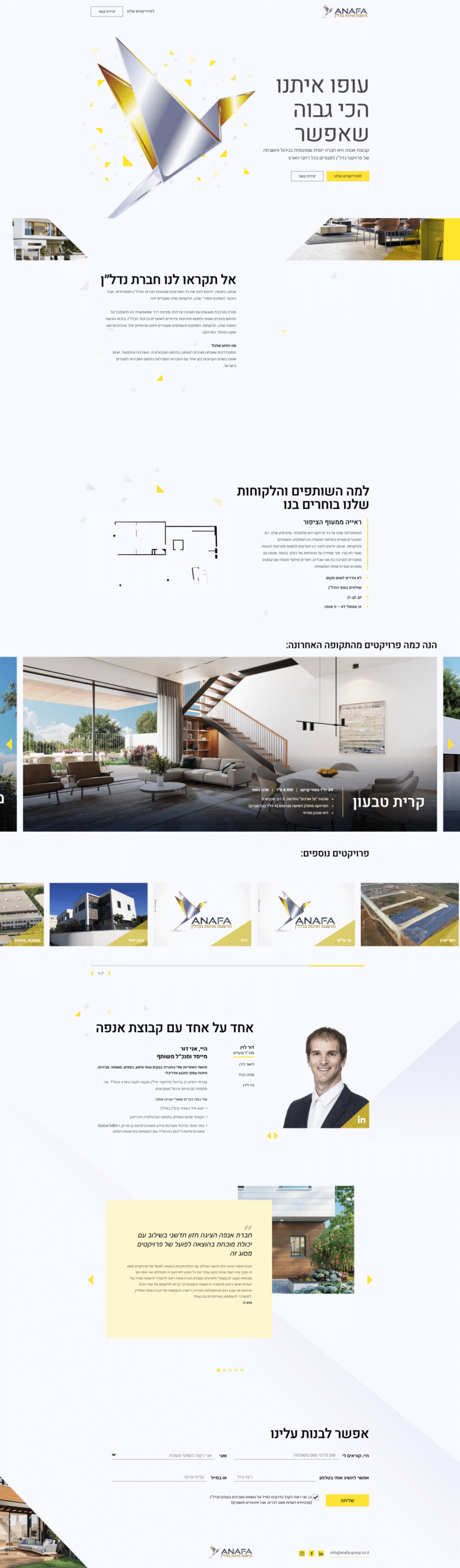 קבוצת אנפה היא חברה יזמית מובילה שמתמחה בניהול והשבחה של פרויקטי נדל״ן למגורים בכל רחבי הארץ. החברה בונה מותג חזק סביב ערכים של אמינות, יוקרה וחדשנות, ומחפשת דרכים מתקדמות לבלוט בשוק תחרותי במיוחד. המשימה המרכזית הייתה לבנות אתר נדל״ן שלא נראה או מתנהג כמו כל היתר. לא עוד עיצוב גנרי או לוח מודעות של נכסים אלא פלטפורמה שמעבירה חוויה רגשית וממותגת שמחברת את הלקוח הפוטנציאלי כבר מהקליק הראשון.